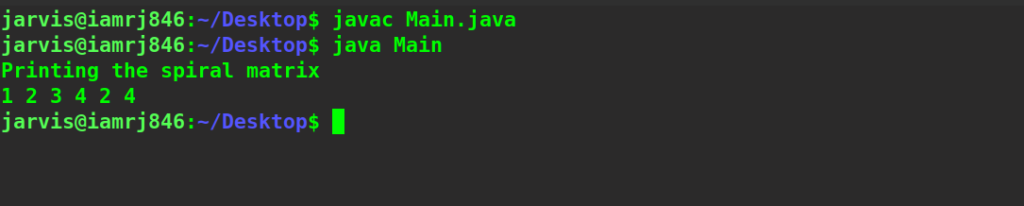 //Importing libraries import java.io.*; import java.util.*; //Creating Main class class Main{ //Function to spiral matrix static void print(ArrayListSpiralForm) { for(int i=0;i<SpiralForm.size();++i) { System.out.print(SpiralForm.get(i)+" "); } } static void spiralMatrix(int matrix[][]) { //Creating four pointers point the all corners of the matrix int top=0;//top corner int left=0;//left corner //right corner int right=matrix[0].length-1; //bottom corner int bottom=matrix.length-1; //Checking the condition while(left<=right&& top<=bottom) { //Printing the rows for(int i=left;i<=right;++i) { System.out.print(matrix[top][i]+" "); } //Update the top pointer ++top; for(int i=top;i<=bottom;++i) { //Printing the column from top to bottom System.out.print(matrix[i][right]+" "); } //Update the right pointer --right; //Checking the condition if(top<=bottom) { //Printing the row from right to left for(int i=right;i>=left;--i) { System.out.print(matrix[bottom][i]+" "); } //Update the bottom pointer --bottom; } if(left<=right) { //Printing the column from bottom to top for(int i=bottom;i>=top;--i) { System.out.print(matrix[i][left]+" "); } ++left; } } } public static void main(String args[]) { //Matrix int matrix[][]= {{1,2,3}, {4,2,4}}; //Printing the spiral matrix System.out.println("Printing the spiral matrix"); //Calling the function spiralMatrix(matrix); System.out.println(); } }