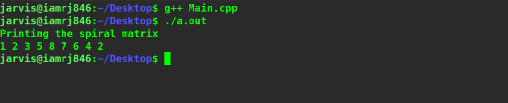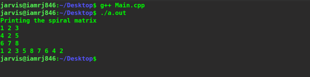 //Importing libraries #include <bits/stdc++.h> using namespace std; #define r 3 #define c 3 void spiralMatrix(int matrix[r][c],int left_pointer,int right_pointer,int top_pointer,int bottom_pointer) { //Printing the top row //Checking the condition if(left_pointer>right_pointer){ return; } //Printing the matrix from left to right for(int i=left_pointer;i<=right_pointer;++i){ cout<<matrix[top_pointer][i]<<" "; } ++top_pointer; //Checking the condition if(top_pointer>bottom_pointer){ return; } //Printing the matrix from top to bottom for(int i=top_pointer;i<=bottom_pointer;++i){ cout<<matrix[i][right_pointer]<<" "; } --right_pointer; //Checking the condition if(left_pointer>right_pointer) return; for(int i=right_pointer;i>=left_pointer;--i){ cout<<matrix[bottom_pointer][i]<<" "; } --bottom_pointer; //Checking the condition if(top_pointer>bottom_pointer) return; //Printing the matrix from bottom to the top for(int i=bottom_pointer;i>=top_pointer;--i){ cout<<matrix[i][left_pointer]<<" "; } ++left_pointer; spiralMatrix(matrix, left_pointer, right_pointer, top_pointer, bottom_pointer); } int main() { // Given Matrix int matrix[r][c]= {{1,2,3}, {4,2,5}, {6,7,8}}; //Creating Four pointers int left=0; int top=0; int right=c-1; int bottom=r-1; //Printing the spiral matrix cout<<"Printing the spiral matrix"<<endl; spiralMatrix(matrix,left,right,top,bottom); cout<<endl; return 0; }
