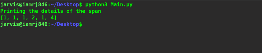#Function to calculate the span details def calulate_stockspan(price_stock,length): #Checking the base condition if(length==0): return 0 else: span=[] for i in range(len(price_stock)): count=1 j=i-1 while j>=0: #Checking the condition of the stock if(price_stock[j]<=price_stock[i]): #Increment the value count=count+1 else: break j=j-1 #Insert the count span.insert(i,count) #Return the span details return span def main(): #List containing stock price price_stock=[100,80,60,70,60,75] #Length of the list length=len(price_stock) print("Printing the details of the span") span=calulate_stockspan(price_stock, length) print(span) main()