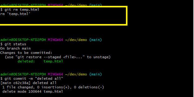 With the help of the git rm command, we can delete or remove files and add them to the git stack. The git rm command not only deletes the file locally, but it adds the deletion operation into the git history.