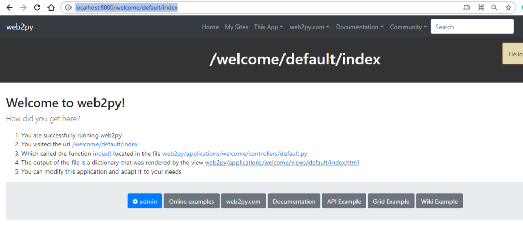 After starting the server, it will open the http://localhost:8000/welcome/default/index on your browser, and you will see a similar screen.