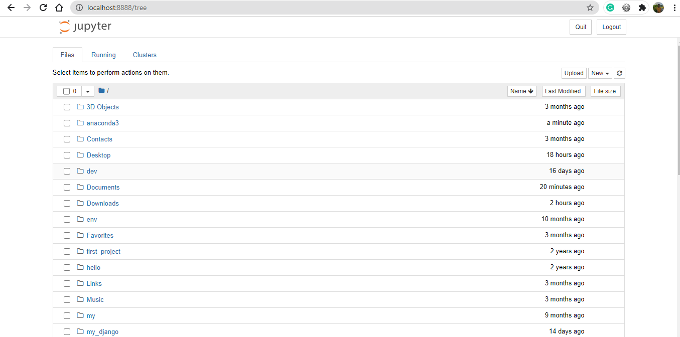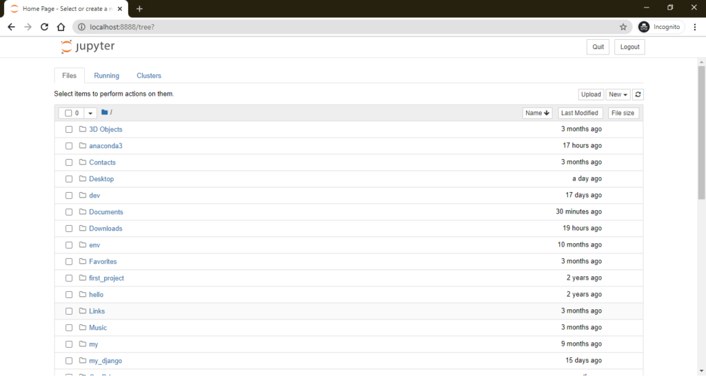 Now Jupyter Notebook is running on your localhost. So now you can surf to the directory where you want to create your project and start coding.