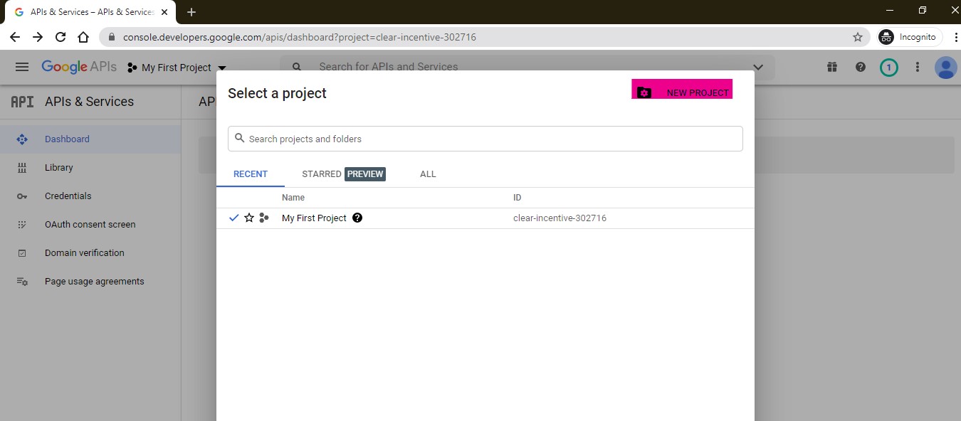 Visit the Google Developer Console Dashboard and log in with your Gmail ID. Once you do that, you will see a Dashboard similar to the one shown below. Here, you need to create a New Project.