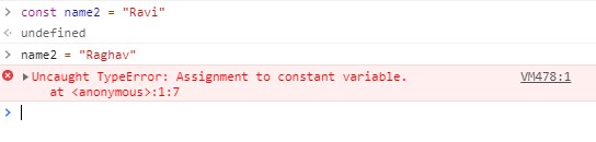 const name2 = "Ravi"; //constant variable name2= "Raghav"; // error