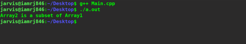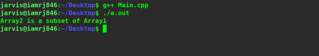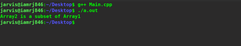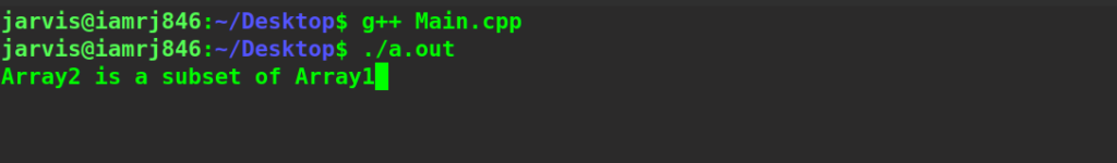 #include <bits/stdc++.h> using namespace std; int main() { int len1,len2,i; int array1[] = { 10,8,5,61,6,0 }; int array2[] = {8,6,0,5 }; len1 = sizeof(array1) / sizeof(array1[0]); len2 = sizeof(array2) / sizeof(array2[0]); unordered_set <int> s1; for (i = 0; i < len1; i++) { s1.insert(array1[i]); } int p = s1.size(); for (i = 0; i < len2; i++) { s1.insert(array2[i]); } if (s1.size() == p) { cout << "Array2 is a subset of Array1"<< "\n"; } else { cout << "Array2 is not a subset of Array1 "<< "\n"; } }