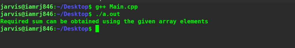 #include <bits/stdc++.h> using namespace std; //arraychecker function to check the 2 values bool arraychecker(int arr[], int array_size,int sum) { int beg,end; //Sorting the array in ascending order sort(arr, arr + array_size); //Finding the required values to get the required sum beg = 0; end = array_size - 1; while (beg < end) { if (arr[beg] + arr[end] == sum) return 1; else if (arr[beg] + arr[end] < sum) beg++; else end--; } return 0; } //Driver Code int main() { int arr[] = { 12,28,7,6 }; int sum = 18; int array_size = sizeof(arr) / sizeof(arr[0]); // Calling arraychecker function if (arraychecker(arr, array_size, sum)) cout << "Required sum can be obtained using the given array elements"; else cout << "Required sum cannot be obtained using the given array elements"; }