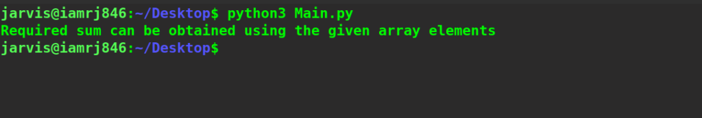 def numbers(arr, sum, x): rem = [] for i in range(x): # adding 0's to rem rem.append(0) for i in range(sum): if (arr[i] < x): rem[arr[i] % x] += 1 # Traversing from start to middle for i in range(1, x // 2): if (rem[i] > 0 and rem[x - i] > 0): print("Required sum can be obtained using the given array elements") break #After reaching middle of array if (i >= x // 2): if (x % 2 == 0): if (rem[x // 2] > 1): # if x is even print("Required sum can be obtained using the given array elements") else: print("Required sum cannot be obtained using the given array elements") else: # if x is odd if (rem[x // 2] > 0 and rem[x - x // 2] > 0): print("Required sum can be obtained using the given array elements") else: print("Required sum cannot be obtained using the given array elements") # Driver Code arr = [ 12,28,7,6 ] sum = 18 arr_size = len(arr) # calling the numbers function numbers(arr, arr_size, sum)