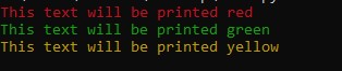 print(Fore.YELLOW+ "This text will be printed yellow")
