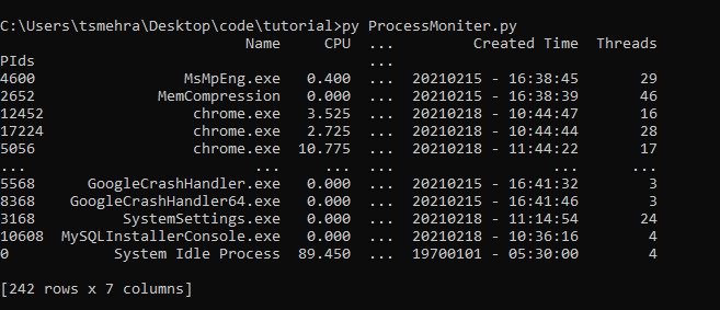 The above program will work fine for Windows 10, but if you are a macOS or Linux user, you can see the psutil documentation if you are getting any errors.