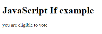 <!DOCTYPE html> <html> <head> <title></title> <script> document.write("<h1> JavaScript If example</h1>"); let age = 21; if (age>=18) { document.write(" you are eligible to vote"); } </script> <body> </body> </html>Output
