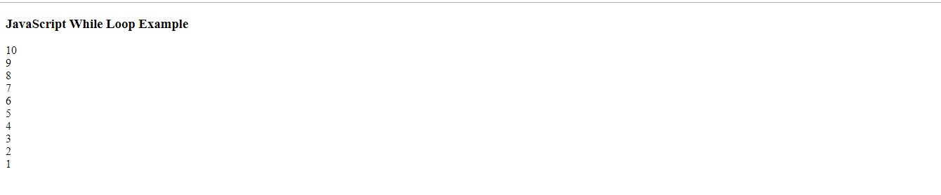 <!DOCTYPE html> <html> <head> <title></title> <script> document.write("<h3> JavaScript While Loop Example</h3>"); let countdown =10; while(countdown>0) { document.write(countdown); document.write("<br>"); //break line //decrease countdown value countdown=countdown-1; } </script> <body> </body> </html>