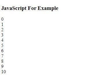 <!DOCTYPE html> <html> <head> <title></title> <script> document.write("<h3> JavaScript For Example</h3>"); for(let counter =0 ; counter<=10; counter++) { document.write(counter) document.write("<br/>") //new line } </script> <body> </body> </html>