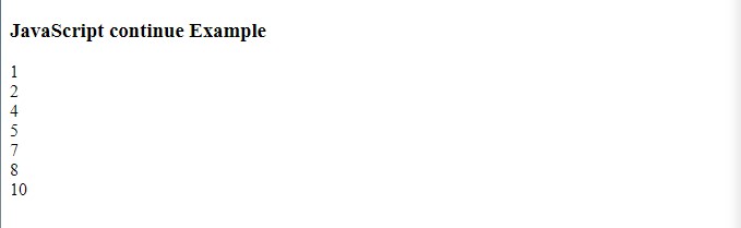 <!DOCTYPE html> <html> <head> <title></title> <script> document.write("<h3> JavaScript continue Example</h3>"); for(let i =1; i <=10; i++) { if(i%3==0) { continue;// do not execute the remaining for block code } document.write(i); document.write("<br>"); } </script> <body> </body> </html>