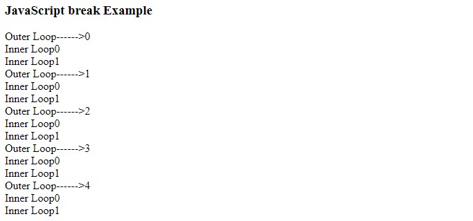 <!DOCTYPE html> <html> <head> <title></title> <script> document.write("<h3> JavaScript break Example</h3>"); for(let i =0; i <5; i++) { document.write("Outer Loop------>"+i); document.write("<br>"); for(let j =0; j<5; j++) { document.write("Inner Loop"+j); document.write("<br>"); if(j==2) { break; //terminate the loop } } } </script> <body> </body> </html>
