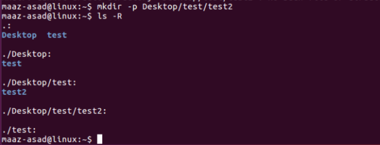 To create a new directory in one of the sub-directories of the present working directory, we use the -p option. For instance, if you wish to create a new directory named "test2" in the "test" sub-directory and you are in the directory named "Desktop" , then you should use this command: