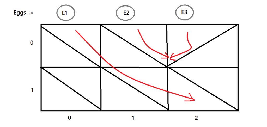 When we are at a cell (row, col) that has the val value 1, this cell will take us to the cell (row+1, col+1), while if we are at a cell (row, col) that has the value -1, this cell will take us to the cell (row+1, col-1). We keep taking the egg down according to the above conditions. We just need to handle the cases below, as they will block the egg from going down. If we find any of the below conditions, while we are a cell, we cannot go beyond the current cell.