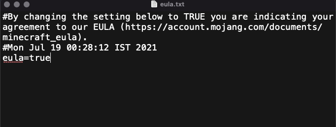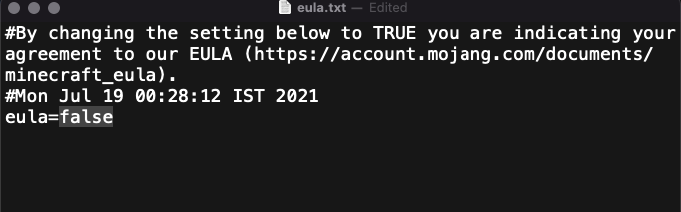 Now, we have to edit the eula.txt file. So, open it in a text editor and edit the following values: