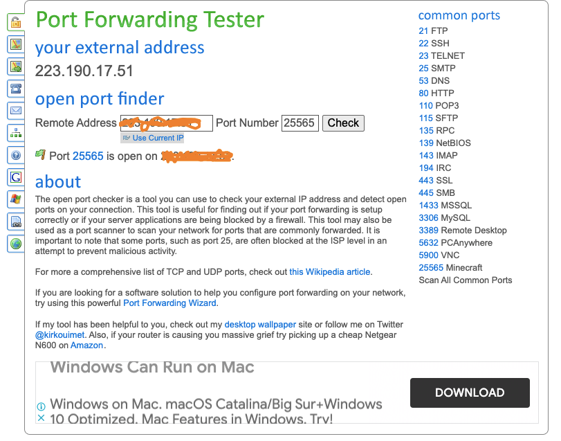 Step 5 : You need to find your public IP address. To do so, head over to YouGetSignal and enter port number 25565. Next, click on check to see if the changes have taken place.