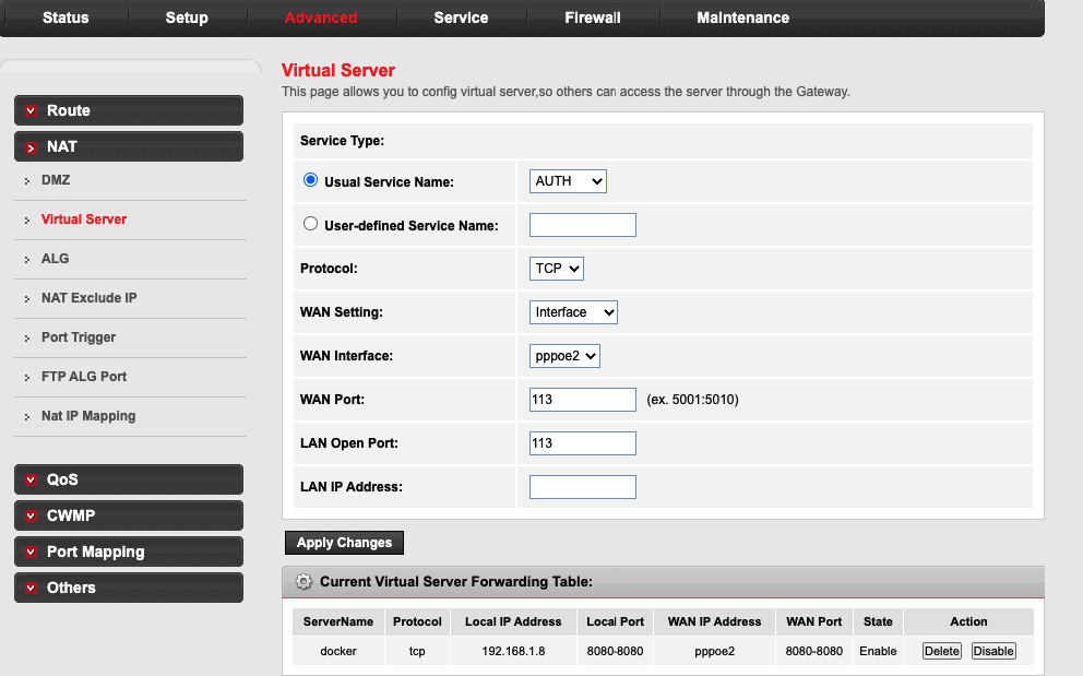 Step 4: Minecraft server works on 25565 port number. We need to open this port for the Minecraft server on the router. First, name your rule by clicking on “User-defined Service Name” and name this rule Minecraft. In the LAN IP address, mention the local IP address of the Minecraft server. In LAN Open Port, mention 25565. In the WAN port, mention 25565. Finally, click on Apply Changes.