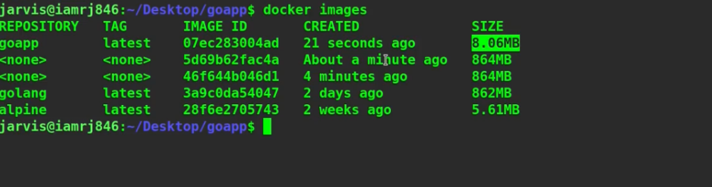 The size of this image is just 8.06 MB which is around a hundred times smaller than the previous one. Hence, we can leverage multi-stage builds to significantly reduce the build time and size of the images.