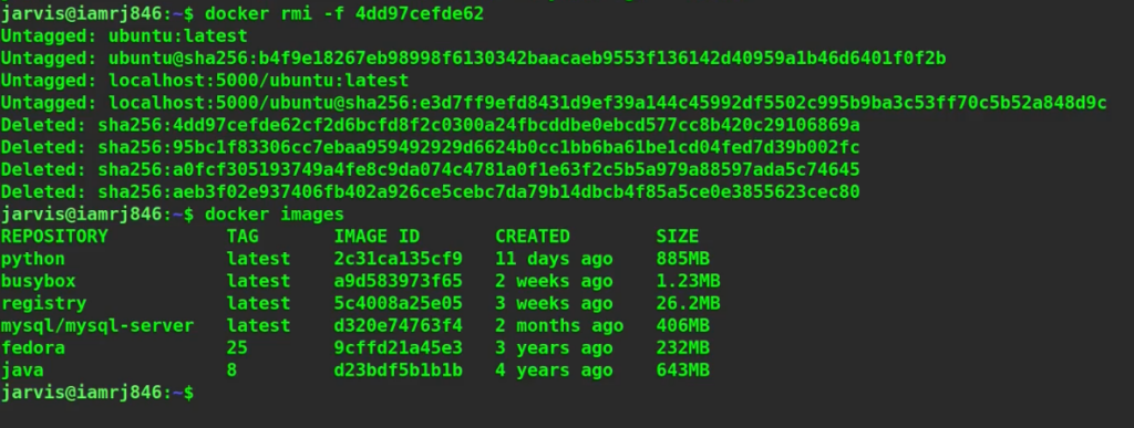 $ docker rmi ubuntu:latest $ docker rmi localhost:5000/ubuntu $ docker images