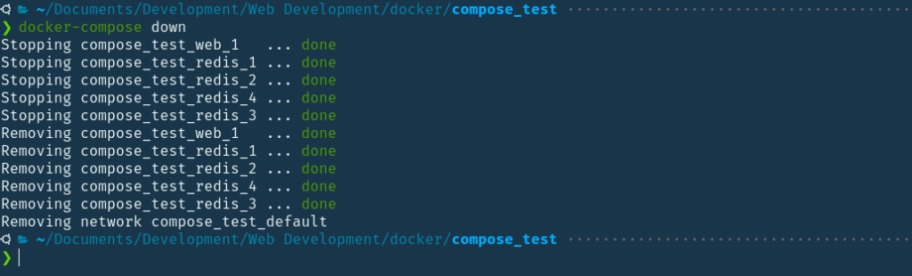 You can see that we had 5 containers running previously. Four of the redis services and 1 for the web. We can notice that the docker-compose down command first stops the services and then it removes it. It also removed the default network or the bridge between the two services.