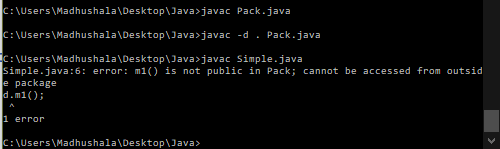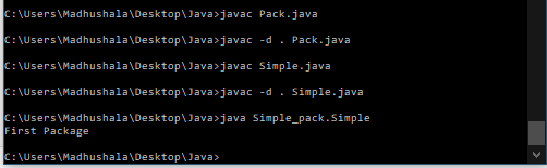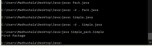Run the commands in the same order as below to compile and run the files. First, compile the class, then compile the package. You can access the class of other packages using the package name only. (simple_pack.simple)- package_name.class_name.
