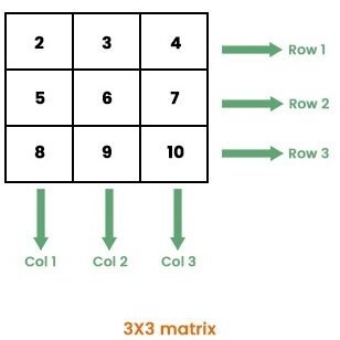 A Python matrix is an array of arrays. In Python, we have the list data structure as an alternative for arrays, that's why we can define a matrix as a list of lists. A Python matrix only follows a two-dimensional structure, which means it stores the data in rows and columns, and the number of columns will be the same for each row. In a matrix, the Horizontal entries are the rows and the Vertical are the columns.