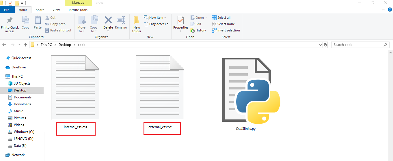 In the program, we have only printed the links for the external CSS. After executing the above program, you can check the directory where your Python Script is located. There, you will find two new files,