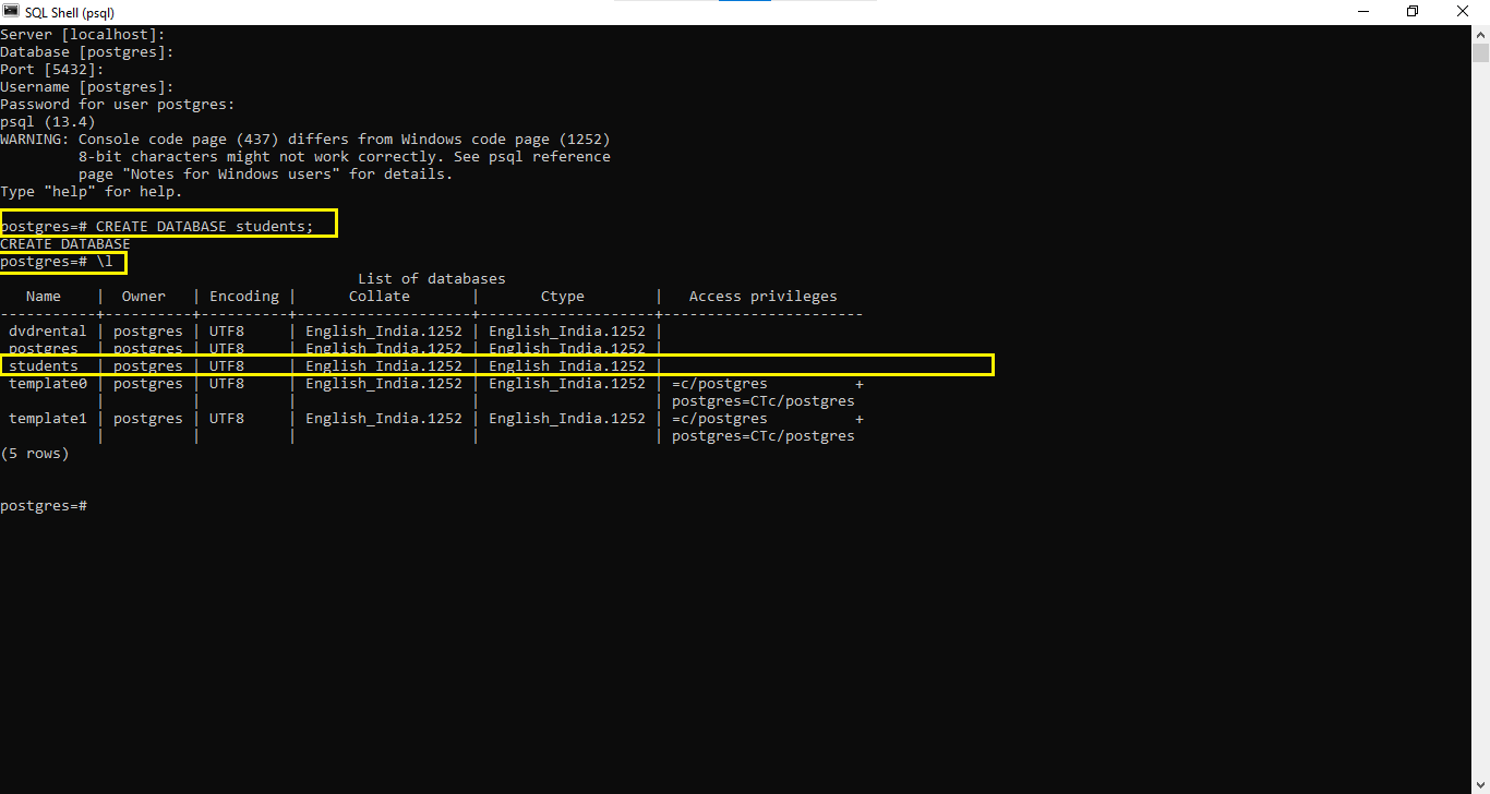 With Python and psycopg2 we can only set the connection between Python and a PostgreSQL database. Before setting up the connection we need to create a Database first then we will connect using it with a Python script using psycopg2. To create a database in PostgreSQL, you can either use the PgAdmin or SQL Shell(psql). It’s straightforward to create a PostgreSQL database using SQL Shell, so we will be using that. To create a new database you can use the
