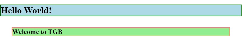 <!DOCTYPE html> <html> <head> <style> h1{ border:2px solid green; background-color:lightblue; } h2{ border:2px solid red; background-color:lightgreen; /*margin of 40px around the h2*/ margin:40px; } </style> </head> <body> <h1>Hello World!</h1> <h2>Welcome to TGB</h2> </body> </html>