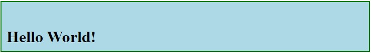 <!DOCTYPE html> <html> <head> <style> div{ border:2px solid black; background-color: lightpink; } h1{ border:2px solid green; background-color:lightblue; /* Padding 52px from all side top right bottom and left */ padding: 52px; /*margin 32 px*/ margin:32px; } </style> </head> <body> <div> <h1>Hello World!</h1> </div> </body> </html>