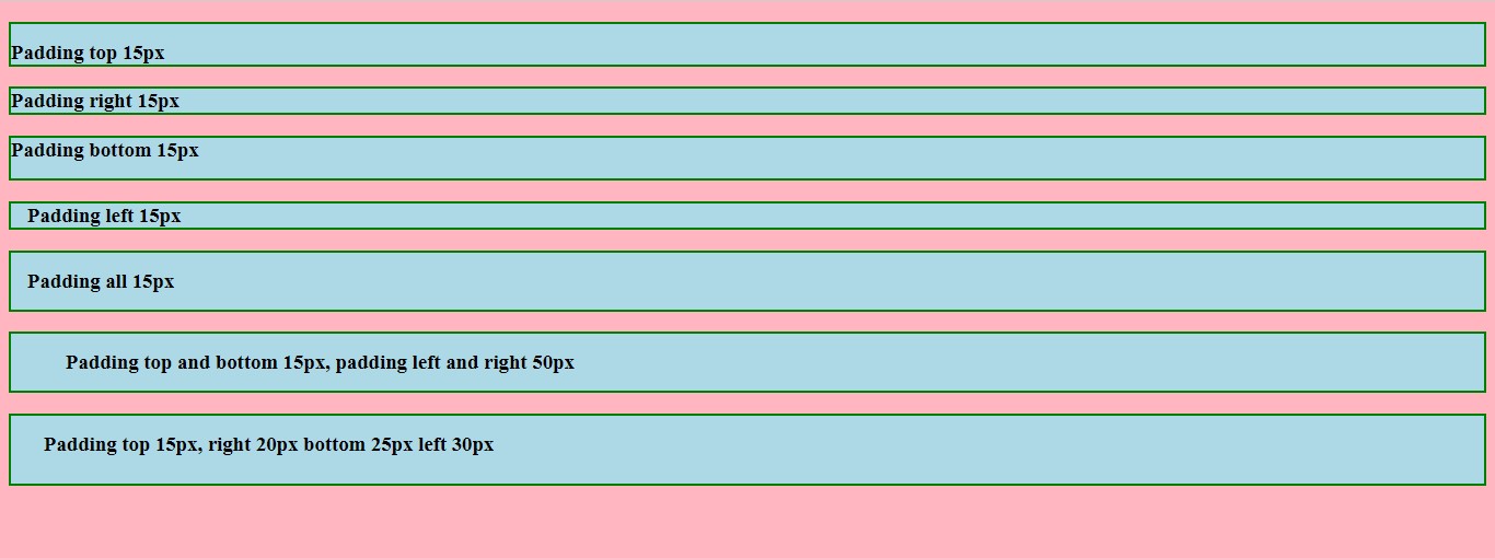 <!DOCTYPE html> <html> <head> <style> body{ background-color:lightpink; } h3{ border:2px solid green; background-color:lightblue; } .a{padding-top:15px;} .b{padding-right:15px; } .c{padding-bottom:15px;} .d{padding-left:15px;} .e{padding: 15px} .f{padding: 15px 50px} .g{padding: 15px 20px 25px 30px} </style> </head> <body> <h3 class="a">Padding top 15px</h1> <h3 class="b">Padding right 15px</h1> <h3 class="c">Padding bottom 15px</h1> <h3 class="d">Padding left 15px</h1> <h3 class="e">Padding all 15px</h1> <h3 class="f">Padding top and bottom 15px, padding left and right 50px</h1> <h3 class="g">Padding top 15px, right 20px bottom 25px left 30px</h1> </body> </html>