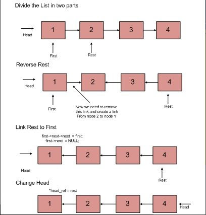 - Call recursive function and link the remaining Linked list to the first node of the original linked list.