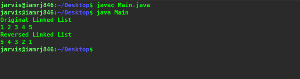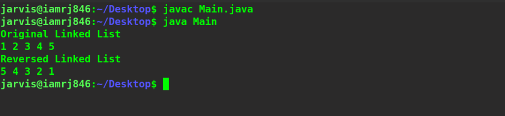 //Importing Libraries import java.util.*; import java.io.*; class Main{ //Creating head reference of the linked list static Node head; //Creating static class of the linked list static class Node{ int data; //Data to be stored in the node of the linked list Node next; //Reference of the node in the linked list //Constructor of the static class public Node(int data){ this.data=data; } } //Function to insert the node in the linked list static void push(int data){ if(head==null){ //Insert the head if the linked list is null head=new Node(data); } else{ Node temp=head; //Iterate the linked list while(temp.next!=null){ temp=temp.next; } temp.next=new Node(data); } } //Function to print the linked list static void print(Node head){ Node temp=head; while(temp!=null){ //Printing the data of the node System.out.print(temp.data+" "); //Increment the node of the linked list temp=temp.next; } System.out.println(); } //Function to reverse the linked list static Node reverse(Node head){ Node current=head; //Creating two reference //First reference Node previous_node=null; Node previous_previous_node=null; while(current!=null){ //Store the current.next reference previous_node=current.next; //Initialize the current.next last previous node current.next=previous_previous_node; //Update the last previous node current element previous_previous_node=current; current=previous_node; } //Return the reversed Linked list return previous_previous_node; } public static void main(String[] args) { //Creating Head of the linked list push(1); //Creating second node of the linked list push(2); //Creating third node of the linked list push(3); //Creating fourth node of the linked list push(4); //Creating fifth node of the linked list push(5); System.out.println("Original Linked List"); print(head); System.out.println("Reversed Linked List"); Node head_reversed=reverse(head); print(head_reversed); } }