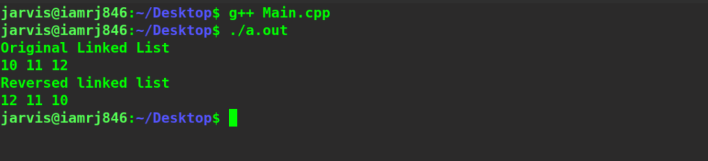 //Importing all the required libraries #include #include #include<bits/stdc++.h> using namespace std; //Creating structure for the node of linked list struct Node{ int data;//data to be stored to the node in the linked list Node*next;//next reference to the node in the linked list //Creating Constructor Node(int data){ this->data=data; //Storing the data to the node this->next=nullptr; } }; //Function to Transverse the Linked list void print(Node *head){ //Checking if the Linked list is null or not Node *temp=head; if(temp==NULL){ return; } //Transverse the Linked List while(temp!=NULL){ cout<data<<" "; temp=temp->next; } } //Function reverse the linked list Node *reverse_LinkedList(Node *head){ //Checking the base condition if(head->next==NULL||head==NULL){ return head; } //Recursively call the remaining node of the linked list Node* remaining=reverse_LinkedList(head->next); //Update the reference of the head pointer head->next->next=head; head->next=NULL; return remaining; } int main(){ //Creating Head of the linked list Node *head =new Node(10); //Creating Second node of the linked list head->next=new Node(11); //Creating third node of the linked list head->next->next=new Node(12); //Printing Original Linked List printf("Original Linked List\n"); print(head); printf("\n"); //Printing Reversed Linked List printf("Reversed linked list\n"); Node * head1=reverse_LinkedList(head); print(head1); return 0; }