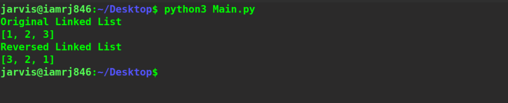 #Creating Node class class Node: #Creating Constructor def __init__(self,data): self.data=data #Creating data to be stored in the node of the linked list self.next=None #Creating next reference of the node #Creating class of Linked class class LinkedList: #Creating Constructor def __init__(self): self.head=None #Funcion to insert new node in the linked list def insert(self,data): #Checking if head is not None if self.head is None: self.head=Node(data) else: last=self.head while(last.next): last=last.next #Insert last node in the linked list last.next=Node(data) #Function to print the Linked list def print(self): #Creating temp reference of the head temp=self.head LinkedList=[] #Iterate the Linked list while(temp is not None): #Storting the node data in the list LinkedList.append(temp.data) temp=temp.next #Printing the list print(LinkedList) #Function to reverse the Linked list def reverse(self): #Creating two reference current=self.head #First reference previous=None #Second reference previous_previous=None while(current is not None): #Store the current.next reference previous=current.next #Initialize the current.next last previous node current.next=previous_previous #Update the last previous node current element previous_previous=current current=previous self.head=previous_previous list=LinkedList() #Inserting First Node in the Linked List list.insert(1) #Inserting Second Node in the Linked List list.insert(2) #Inserting Third Node in the Linked List list.insert(3) print("Original Linked List") list.print() list.reverse() #Printing Reversed Linked List print("Reversed Linked List") list.print()
