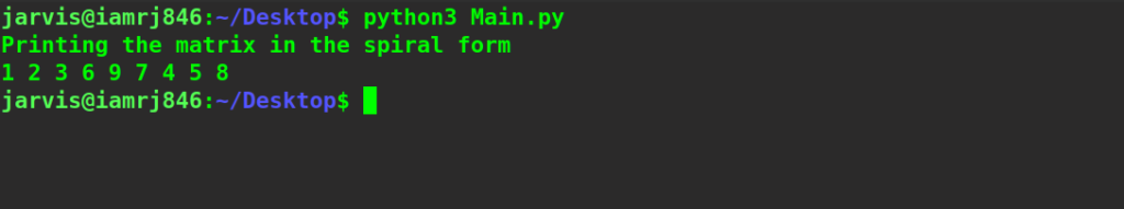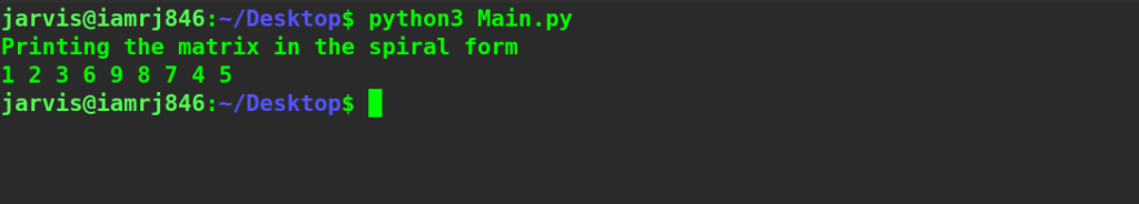 #Function to print the spiral matrix def printspiral(mat,left_pointer,right_pointer,top_pointer,bottom_pointer): #Creating Four reference that point to the all corners of the matrix #Checking the condition if left_pointer>right_pointer: return #Print the row first from left to right for index in range(left_pointer,right_pointer+1): print(mat[top_pointer][index],end=" ") top_pointer=top_pointer+1 #Checking the condition if top_pointer>bottom_pointer: return #Printing the matrix from top to bottom for index in range(top_pointer,bottom_pointer+1): print(mat[index][right_pointer],end=" ") right_pointer=right_pointer-1 #Checking the condition if(left_pointer>right_pointer): return #Printing the matrix from right to left for index in range(right_pointer,left_pointer-1,-1): print(mat[bottom_pointer][index],end=" ") bottom_pointer=bottom_pointer-1 #Checking the condition if(top_pointer>bottom_pointer): return #Printing the matrix from bottom to top pointer for index in range(bottom_pointer,top_pointer-1,-1): print(mat[index][left_pointer],end=" ") left_pointer=left_pointer+1 #Recursively call return printspiral(mat,left_pointer,right_pointer,top_pointer,bottom_pointer) #Main Function def main(): #Matrix mat = [ [1,2,3] ,[4,5,6], [7,8,9] ] #Call Function to print the spiral matrix print("Printing the matrix in the spiral form") #Creating Four pointers top=0 left=0 bottom=len(mat)-1 right=len(mat[0])-1 printspiral(mat,left,right,top,bottom) #Calling the main function main()