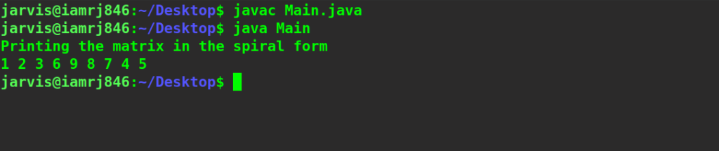//Importing libraries import java.util.*; import java.io.*; class Main{ //Function to print the spiral matrix static void spiralmatrix(int matrix[][],int left_pointer,int right_pointer,int top_pointer,int bottom_pointer ){ //Printing the top row //Checking the condition if(left_pointer>right_pointer){ return; } //Printing the matrix from left to right for(int i=left_pointer;i<=right_pointer;++i){ System.out.print(matrix[top_pointer][i]+" "); } ++top_pointer; //Checking the condition if(top_pointer>bottom_pointer){ return; } //Printing the matrix from top to bottom for(int i=top_pointer;i<=bottom_pointer;++i){ System.out.print(matrix[i][right_pointer]+" "); } --right_pointer; //Checking the condition if(left_pointer>right_pointer) return; for(int i=right_pointer;i>=left_pointer;--i){ System.out.print(matrix[bottom_pointer][i]+" "); } --bottom_pointer; //Checking the condition if(top_pointer>bottom_pointer) return; //Printing the matrix from bottom to the top for(int i=bottom_pointer;i>=top_pointer;--i){ System.out.print(matrix[i][left_pointer]+" "); } ++left_pointer; spiralmatrix(matrix, left_pointer, right_pointer, top_pointer, bottom_pointer); } public static void main(String[] args) { int matrix[][]={{1,2,3}, {4,5,6}, {7,8,9}}; //Creating four pointers int left=0; int top=0; int right=matrix[0].length-1; int bottom=matrix.length-1; //Call function to print the matrix int spiral form System.out.println("Printing the matrix in the spiral form"); spiralmatrix(matrix,left,right,top,bottom); System.out.println(); } }
