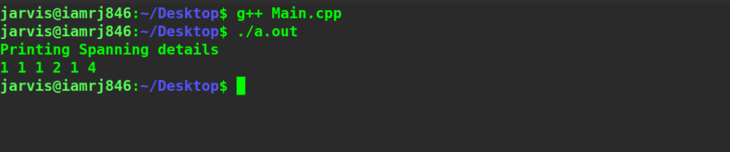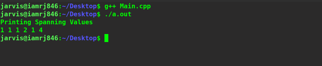 //Importing the libraries # include <iostream> #include <bits/stdc++.h> using namespace std; int span_recursive(int previous_index,int starting_index,int price_stock[],int price){ //Checking base condition if(previous_index<0){ return 0; } //Checking the price of previous day stock if(price_stock[previous_index]>price){ return 1; } //Call next previous day stock int span=1+ span_recursive(previous_index-1, starting_index, price_stock, price); //Return the answer return span; } //Function to calculate the span of the stock price on a particular day void calulate_stockspan(int price_stock[],int length,int starting_index,int span[]){ for(int i=starting_index;i<length;++i){ //Call recursive function to calculate individual stock span int ans=span_recursive(i-1,i,price_stock,price_stock[i]); span[i]=ans; } } void print(int span[],int length){ for(int i=0;i<length;++i){ cout<<span[i]<<" "; } } int main(){ //Array containing stock price int price_stock[]={100,80,60,70,60,75}; //Length of the array int length=sizeof(price_stock)/sizeof(price_stock[0]); //Creating an array to store the details of the stock int span[length]; //Function to calculate the span calulate_stockspan(price_stock, length,1,span); //Print the span details printf("%s\n","Printing Spanning Values"); span[0]=1; print(span,length); return 0; }
