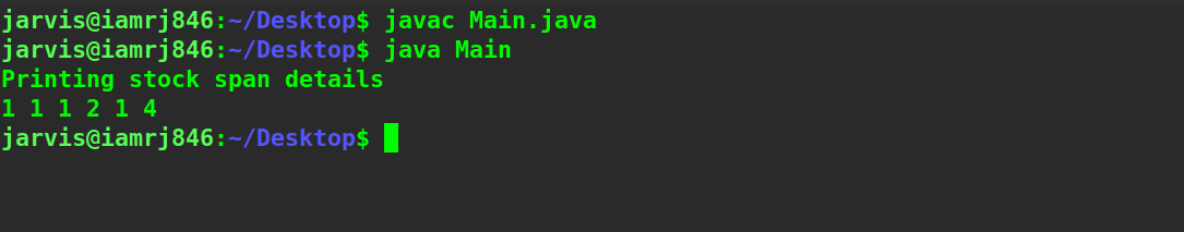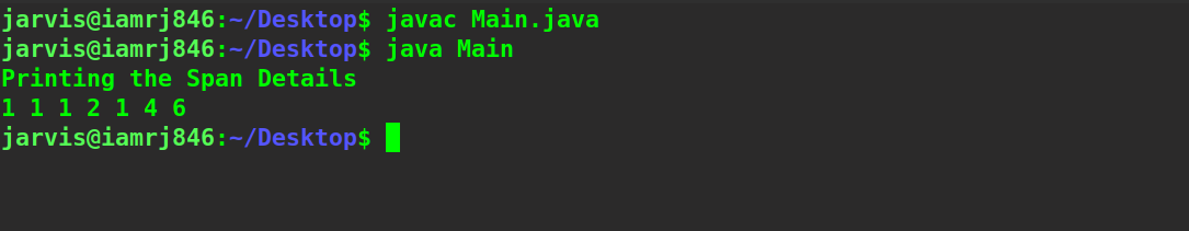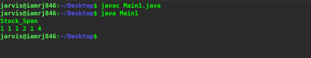 //Importing the libraries import java.util.*; //Creating class class Main1{ //Function to print the span details of the stock static void print(int arr[]){ for(int i=0;i<arr.length;++i){ //Printing the span details System.out.print(arr[i]+" "); } } //Function to calculate the span details of the stock price static int [] span(int arr[],int length){ //Creating stack to store the minimum stock price StackS=new Stack(); //Creating array to store the span details int span[]=new int[length]; for(int i=0;i<length;++i){ //Checking the condition while(!S.empty()&& arr[S.peek()]<=arr[i]){ //Pop the index from the array S.pop(); } //Checking the condition if(S.empty()){ //Push the element into the stack S.add(i); //Update the array span[i]=i+1; } else{ span[i]=i-S.peek(); S.add(i); } } //Return the span array return span; } public static void main(String args[]){ int arr[]={100,80,60,70,60,75,85}; int length=arr.length; //Call function to calculate the span details of the stock price and returning the array int span[]=span(arr,length); System.out.println("Printing the Span Details"); print(span); } }