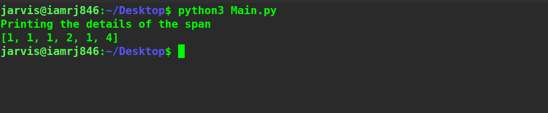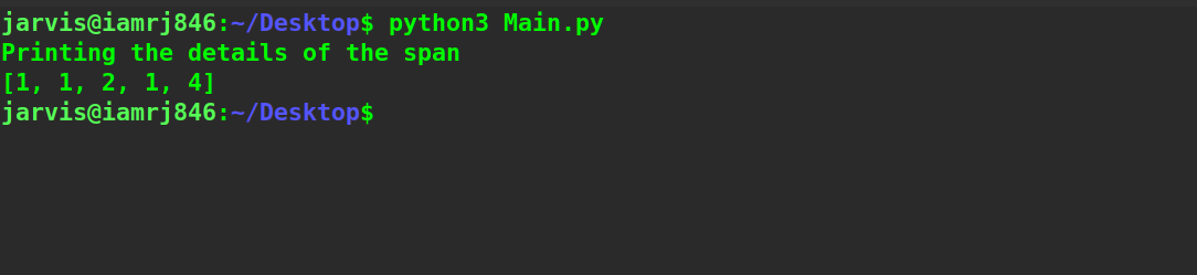 #Function to calculate the span details def calulate_stockspan(price_stock,length): #Checking the base condition if(length==0): return 0 else: span=[] for i in range(len(price_stock)): count=1 j=i-1 while j>=0: #Checking the condition of the stock if(price_stock[j]<=price_stock[i]): #Increment the value count=count+1 else: break j=j-1 #Insert the count span.insert(i,count) #Return the span details return span def main(): #List containing stock price price_stock=[100,80,60,70,60,75] #Length of the list length=len(price_stock) print("Printing the details of the span") span=calulate_stockspan(price_stock, length) print(span) main()