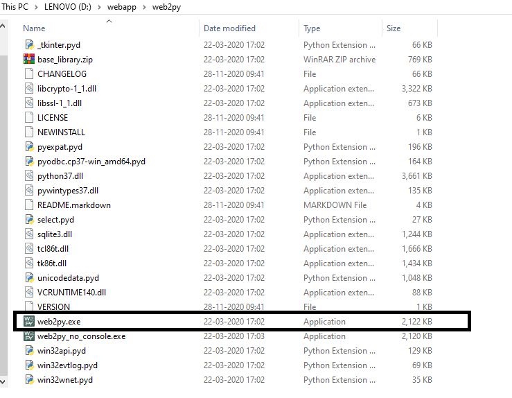 After downloading the web2py binary zip file unzip it, in a folder or directory.