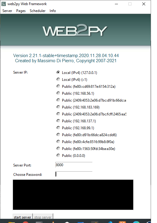Now it will open a web2py web framework window, where you need to set the password and click on the start server button, and it will run a localhost server on port number 8000.