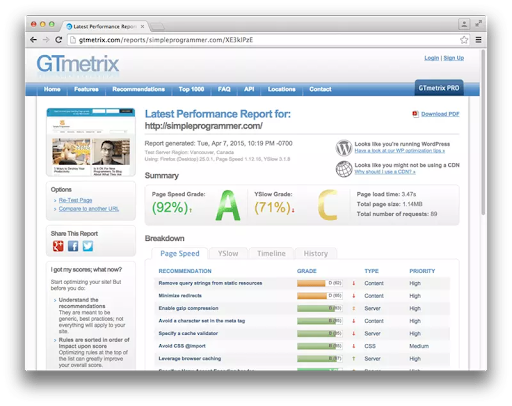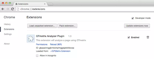 You can access the “Developer Mode” to enable loading unpacked extensions. You can now load your extension from the project folder. Click on the “Load unpacked extension” or simply drag the “GTmetrix Extension” folder onto the page for loading the extension. The extension will immediately show up as a Browser Action in the toolbar of the current tab. To test the extension, go to a page you want to test with GTmetrix. Click the GTmetrix extension icon, and after the popup window appears, click on the “Check this page now!” button. You will see the page speed metrics for the current webpage.