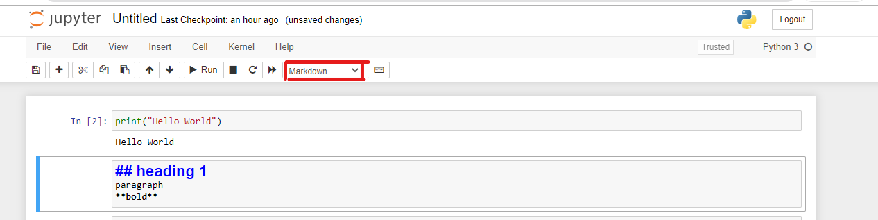 The type of Cell selected can be toggled from the menu. To execute the code and markdown written in the cell, use the