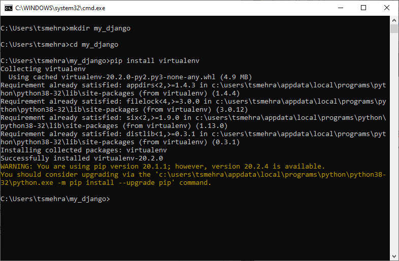 Note: If virtualenv is already installed, you will be getting response Requirement already satisfied: