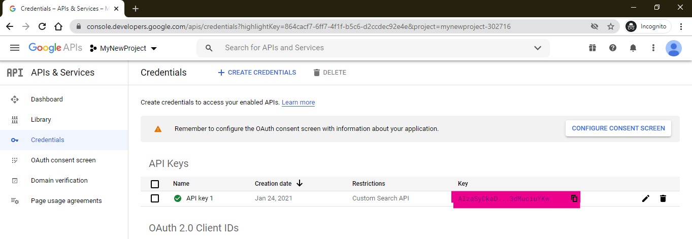 In this Python tutorial, you learned how to set up Custom Search Engine API on the Google API console, how to create a Custom Search Engine, and how to write a Python program to interact with the Google Custom Search Engine API. To Interact with the Google CSE, you need the CSE API and the Custom Search Engine ID, and you all are good to go. While creating the API, do not share the API key or ID with anyone.