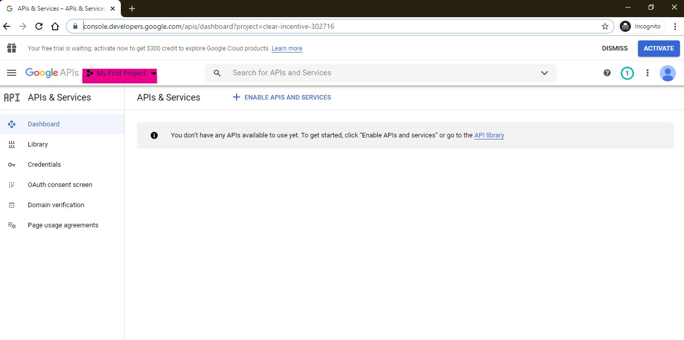 Now, click on the ENABLE button, and this will enable the Custom Search API for our current project.