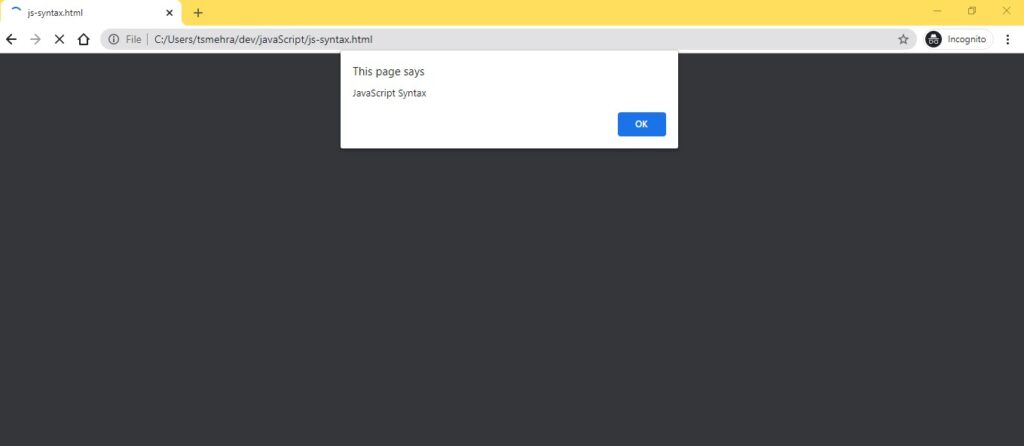 <!DOCTYPE html> <html> <head> <title></title> <script> alert("JavaScript Syntax")</script> </head> <body> <h1>Syntax Tutorial Internel JavaScript</h1> </body> </html>As the browser parse the HTML document from top to bottom, that's why the